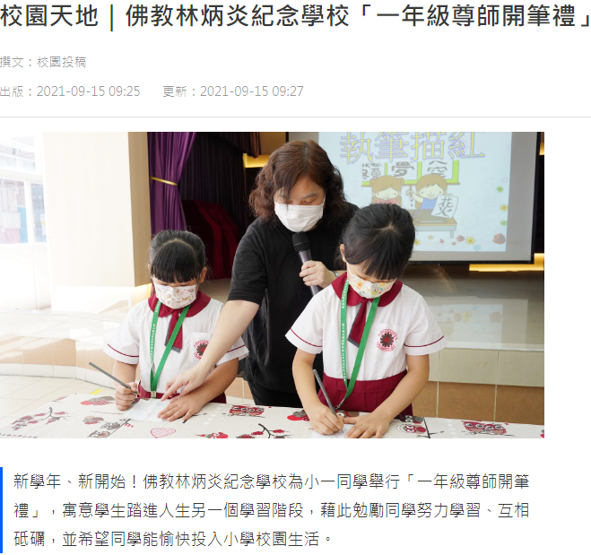 香港01 校園天地 佛教林炳炎紀念學校 一年級尊師開筆禮 報導 2021年9月15日 佛教林炳炎紀念學校